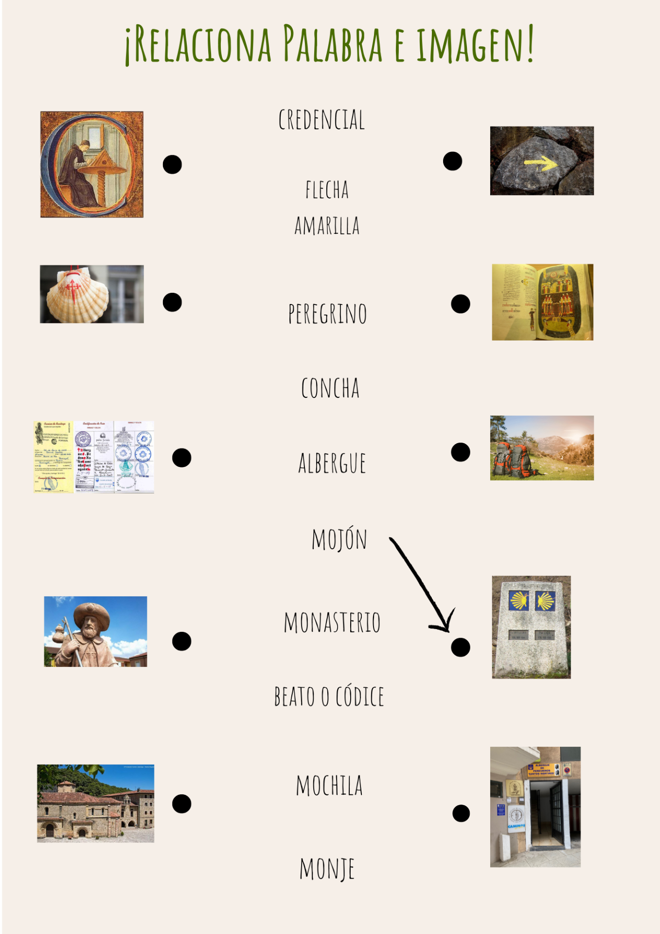 - Realizan la actividad visual en parejas para practicar su comprensión lectora (ver abajo). Van a unir, por medio de flechas, 10 imágenes y 10 palabras relacionadas con el Camino.